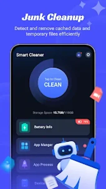 A Smart Cleaner, Android kullanıcıları için tasarlanmış bir yardımcı programdır. Bu uygulama, telefonun gereksiz dosyalarını temizleyerek depolama alanını optimize etmeye yardımcı olur. Kullanıcılar, geçici dosyalar ve önbellek dosyaları gibi telefon atıklarını kolayca temizleyebilir. Ayrıca, pil durumu ve cihaz bilgilerini hızlıca kontrol etme imkanı sunar. Uygulama yönetimi özelliği ile arka planda çalışan uygulamaları tespit edip hızlıca yönetebilirsiniz.